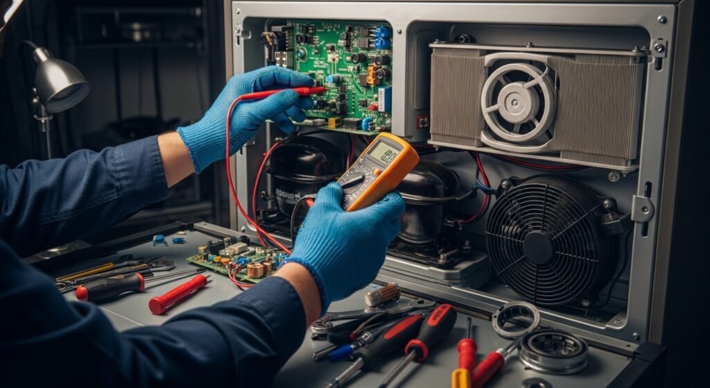 نقدم حلولاً متكاملة واحترافية لإصلاح الثلاجات للمنازل والشركات. فنيونا الخبراء مدربون على تشخيص وإصلاح جميع أنواع أعطال الثلاجات بسرعة وكفاءة.